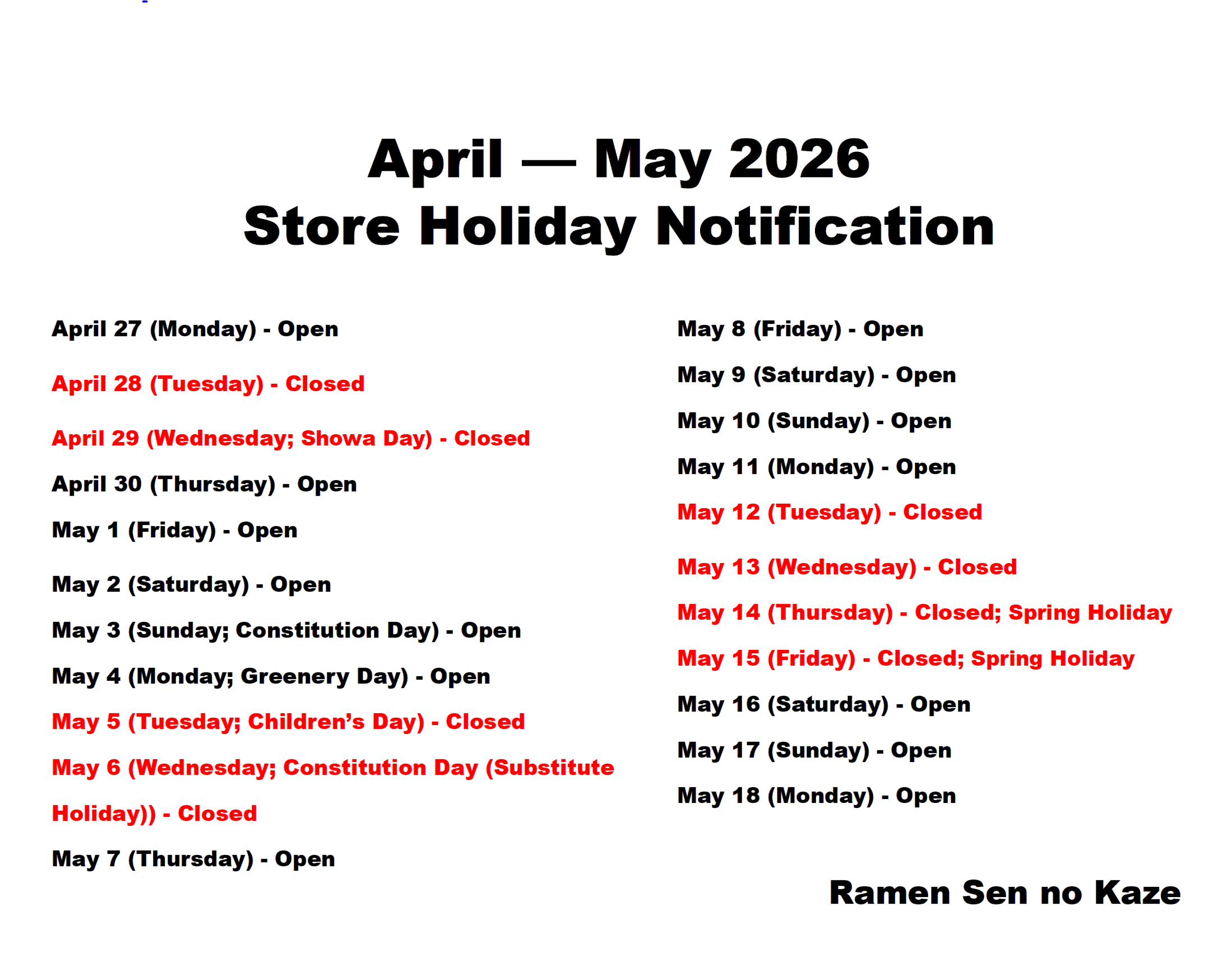 Ramen Sen no Kaze Kyoto è ora chiuso ogni Martedì e Mercoledì.
